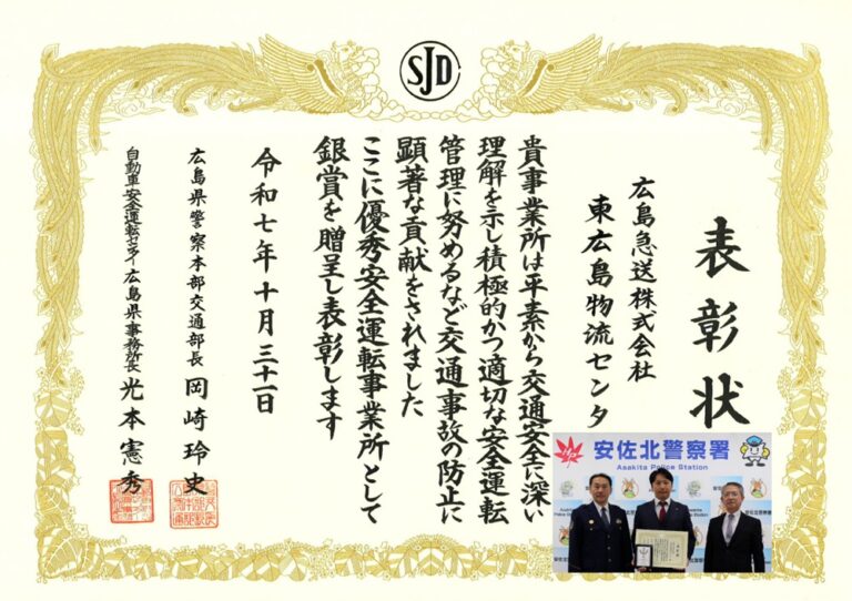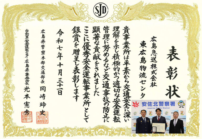 安佐北警察署において、「優秀安全運転事業所表彰」「銀賞」を受賞